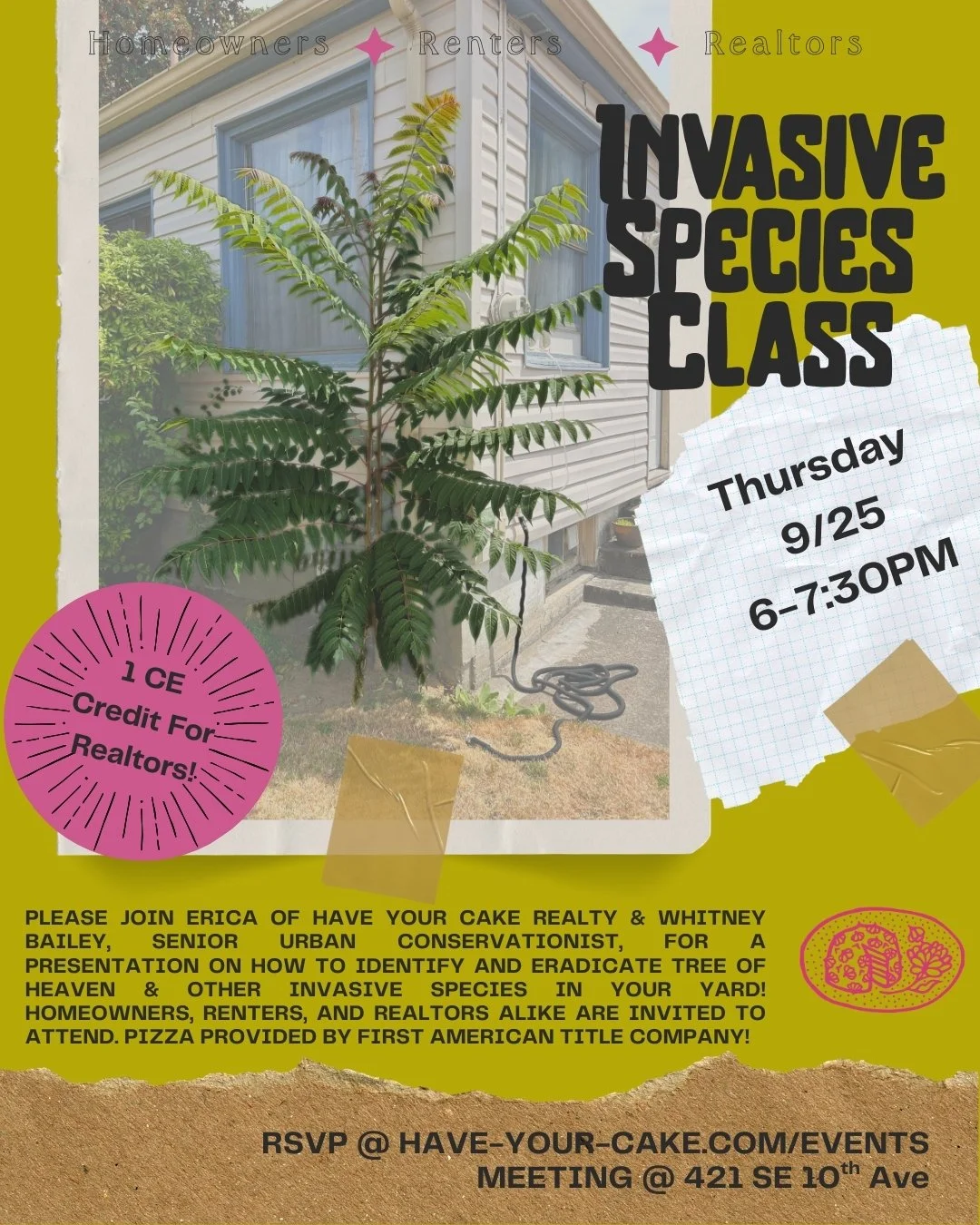 Please join me and Senior Urban Conservationist for the East Multnomah Soil & Water Conservation District for a presentation about how to identify & eradicate invasive species in Portland. Eliminating the tree of heaven (hell!) is of particular importance, as it is extremely harmful to building structures and native flora and fauna. Learn all about its evil ways and how to get rid of it for good during this class. It will also be *1 continuing education credit hour* for all you realtors out there who want to learn more about this awful tree.